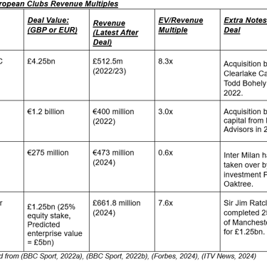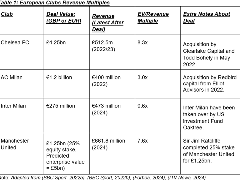 Compared with other European club acquisitions, Chelsea’s multiple stands out with a reading of 8.3x. Deals such as AC Milan’s (3×) and Inter Milan’s (0.6×) were much lower, reflecting weaker commercial structures and less lucrative broadcasting. Manchester United’s implied 7.6× multiple is the closest to the reading, showing how the Premier League’s global appeal consistently attracts higher valuations.